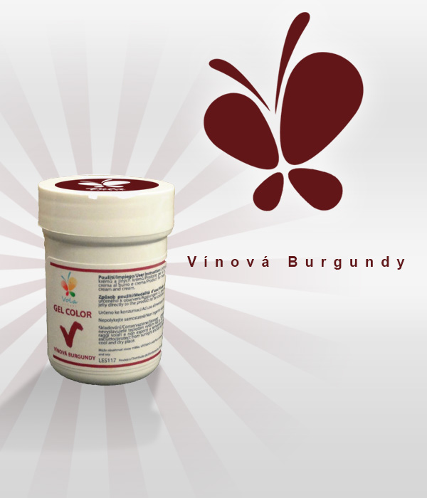 Potravinářská vínová (Burgundy) barva ve formě gelu. Různé barvy je možné smíchat a vytvořit tak nové odstíny.