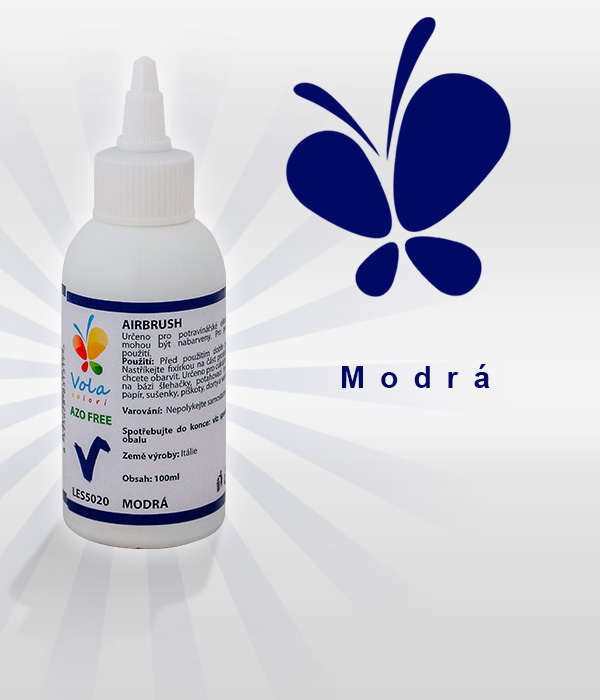 Potravinářská barva do fixírky modrá, vyvinutá pro přesné a hladké rozprašování, které umožňuje vytvoření stejnorodého a jemného povrchu.