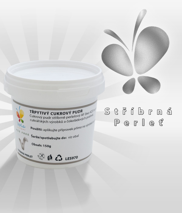 Cukrový pudr stříbrně perleťový AF (bez AZO barviv) ke zdobení cukrářských výrobků a čokoládových pralinek. Aplikujte přípravek přímo na výrobek ke zdobení. Složení: cukr, barviva: E171, E172