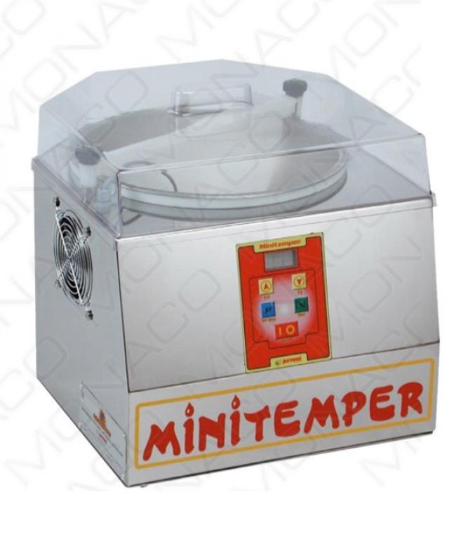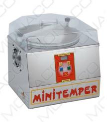 Stolní tempírka malých rozměrů. Temperace čokolády probíhá ve 3 fázích pomocí otáčení mísy proti statické stěrce.