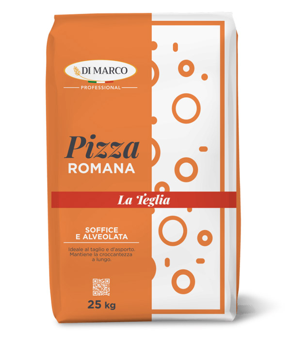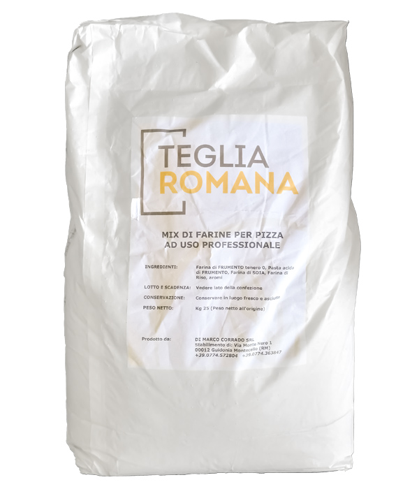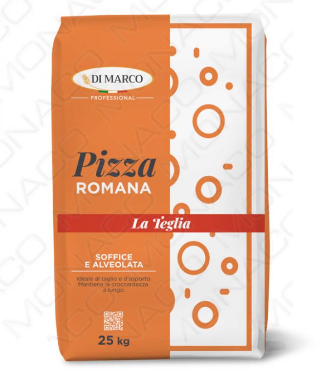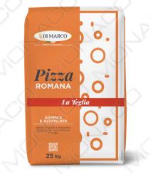 Speciální mouka pro římský typ pizzy „Pinsa Romana Teglia“ na plech. Pinsa Romana se vyznačuje křupavým povrchem, vláčností uvnitř a lehkou nadýchanou strukturou. Toho dosáhneme, pokud těsto absorbuje co největší množství vody,což závisí na kvalitě mouky a dalších surovin. Vysoce kvalitní pšeničná mouka je obohacena o mouku s vysokým obsahem vlákniny, dále rýžovou a sojovou mouku. Každá z těchto surovin má určitou schopnost: vybraná italská pšeničná mouka s vysokým obsahem bílkovin, váže až 80% vody a umožňuje těstu kynout až 48 hodin, což činí těsto lehce stravitelné. Rýžová mouka zadržuje vodu i po propečení výrobku a zároveň napomáhá křehkosti a křupavosti povrchu. Dále mouka ze sóji obsahuje kvalitní rostlinné bílkoviny, které plně nahrazují vlastnosti sádla, přidávaného běžně do pizzy. Díky použití sojové mouky, je pak výrobek 100% rostlinného původu. Další složkou je kvalitní přírodní sušený kvásek, který zajišťuje stejnoměrné kynutí, standardní kvalitu a také šetří čas a náklady na výrobu. Vše obohacuje mouka z části zrna sousedícího s otruby, která se běžně odstraňuje, i když je bohatá na vlákninu. Výrobci Di Marco se povedlo tuto mouku unikátně přidat k již zmíněným, což činí Pinsu výživově hodnotou a chutnou. Tato optimalizovaná směs mouk je výsledkem dlouholetého vývoje a italské tradice, za vzniku famózní „Pinsy Romany“, která se neliší od klasické pizzy pouze tvarem, ale hlavně chutí, křehkostí a výrobním postupem. V Výrobní postup Vás můžeme naučit u Vás v provozovně nebo u nás na kuzech "Pinsa Romana".