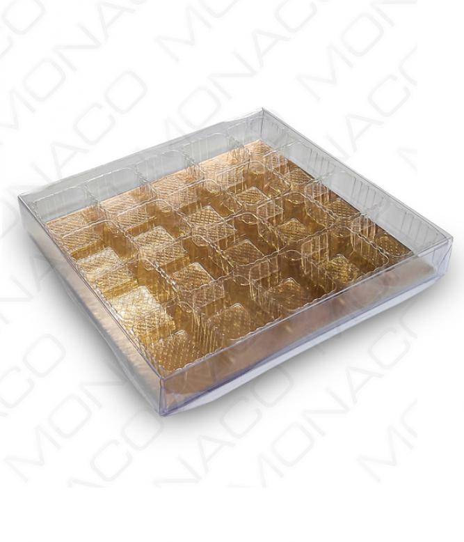 Průhledná plastová krabička s průhlednou vložkou na pralinky a se zlatou papírovou podložkou.