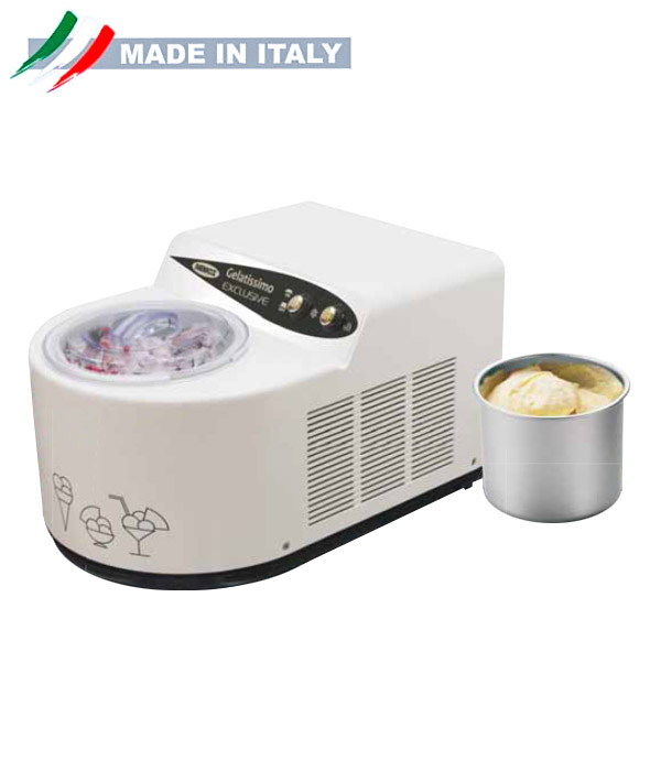 Domácí stolní výrobník zmrzliny. Dvě výrobní nádoby (vyjímatelná nádoba a vana ve stroji) umožňují rychlou výrobu více druhů zmrzliny. Zmrzlina je hotová za 20-30 minut - cca 3 l / hodinu.