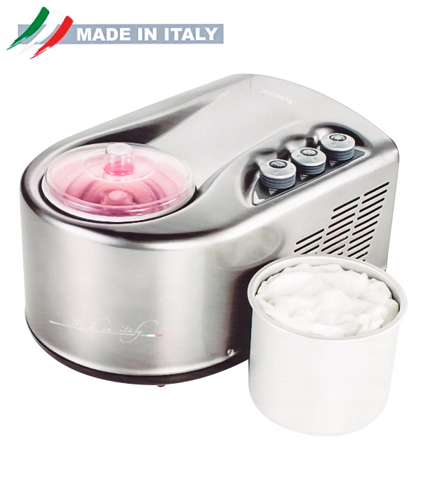 Domácí stolní výrobník zmrzliny. Dvě výrobní nádoby (vyjímatelná nádoba a vana ve stroji) umožňují rychlou výrobu více druhů zmrzliny.