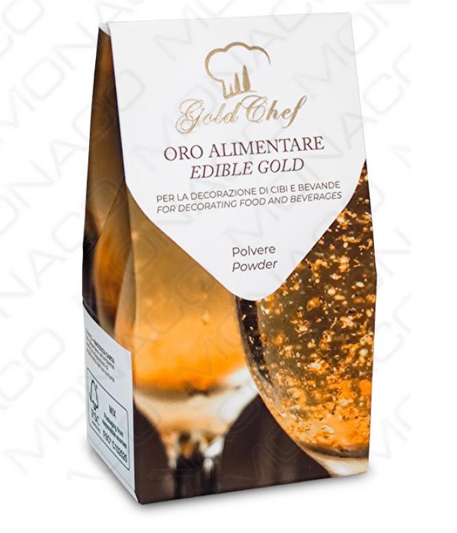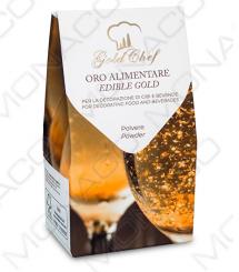 Jedlé zlato v prášku. Díky své třpytivosti je prášek ideální jako dekorace do nápojů (šampaňské), na slavnostní dezerty a první chody, nebo v cukrářské a pekařské výrobě.