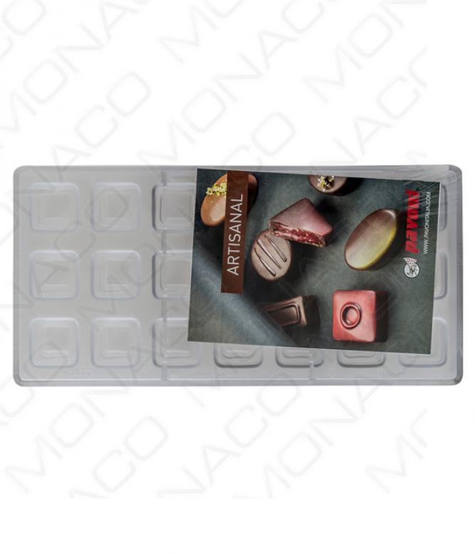 Pevná obdélníková polykarbonátová forma 3x7 tvarů na výrobu čokoládových pralinek.