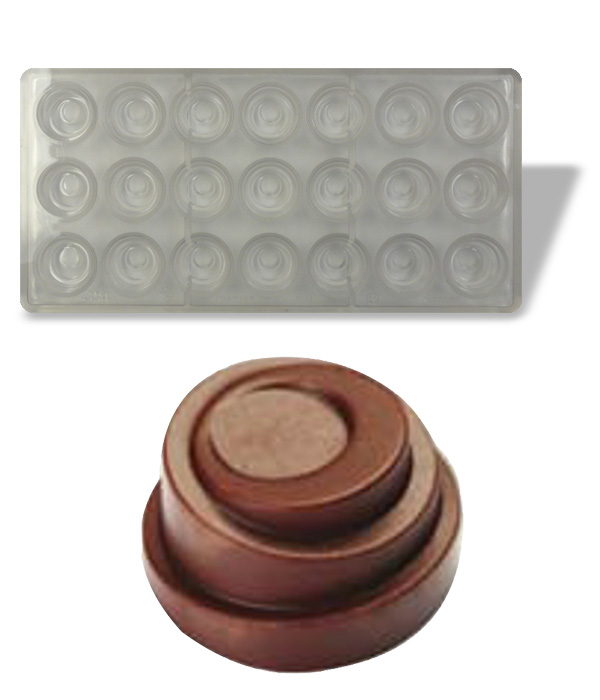 Pevná obdélníková polykarbonátová forma 3x7 tvarů na výrobu čokoládových pralinek.