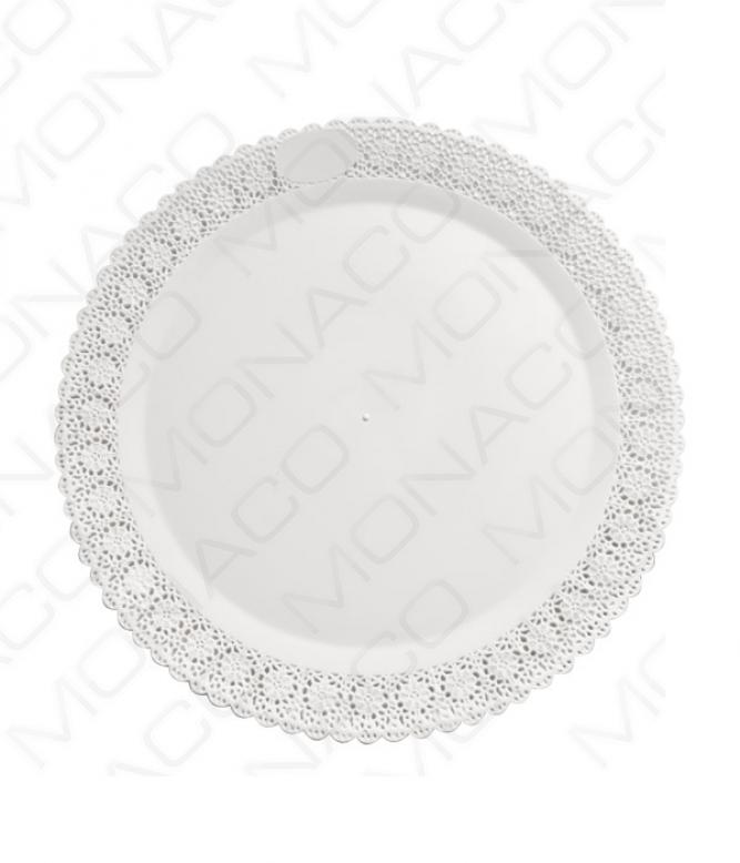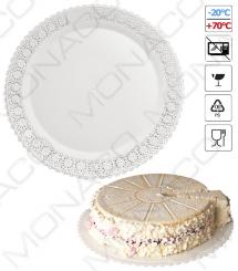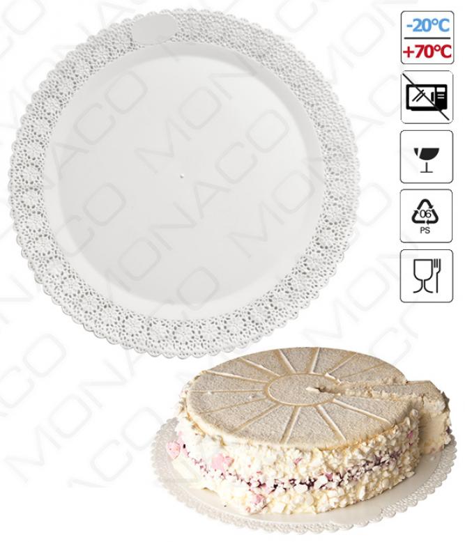 Plastová podložka pod dort s krajkou, vhodná pro kontakt s potravinami.Plastové výlisky z lehkého plastu (dekorační lem nemusí být vždy kompletně vyražen).