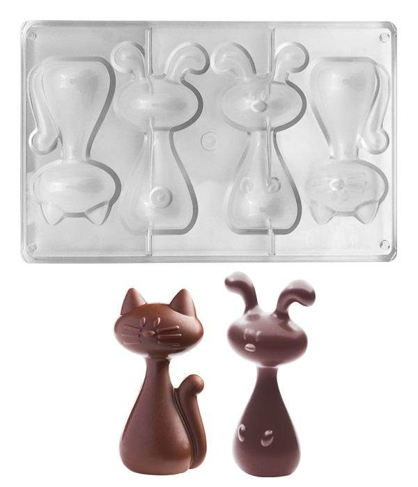 Cukrářská pevná forma in PC na výrobu čokoládových pralinek ve tvaru kočičky a zajíčka. Každá forma obsahuje přední a zadní část zvířátka.