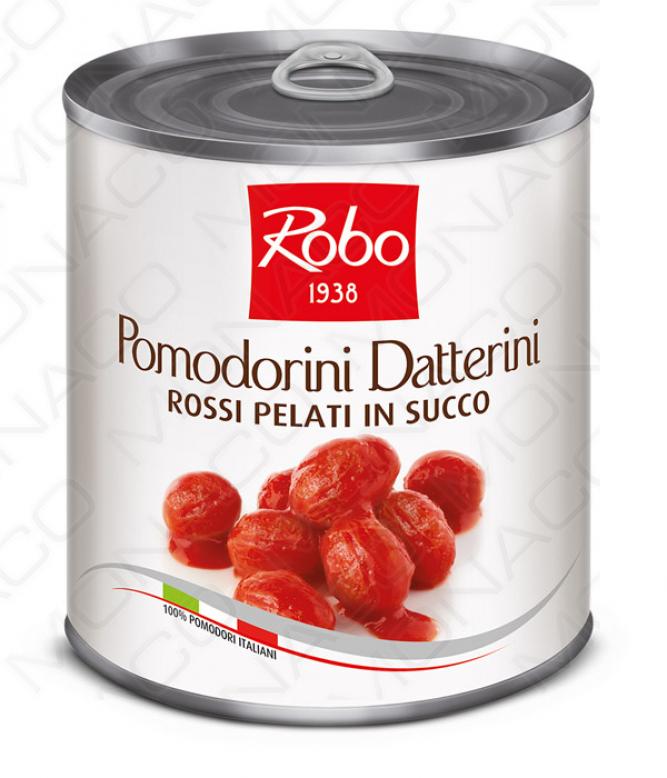 Pomodorini datterini jsou typicky oválná rajčátka, celá, loupaná naložená ve vlastní šťávě.