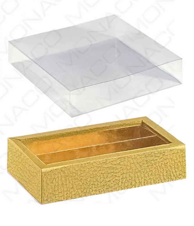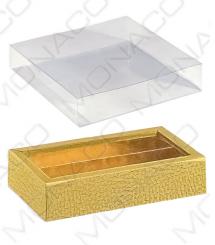 Velice elegantní papírová krabička na pralinky ve zlaté barvě s jemným reliéfním vzorem imitace kůže. Dodáváno s průhledným plastovým obalem.