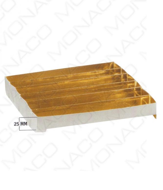 Velice elegantní papírová krabička na pralinky ve zlaté barvě s jemným reliéfním vzorem imitace kůže. Dodáváno s průhledným plastovým obalem.