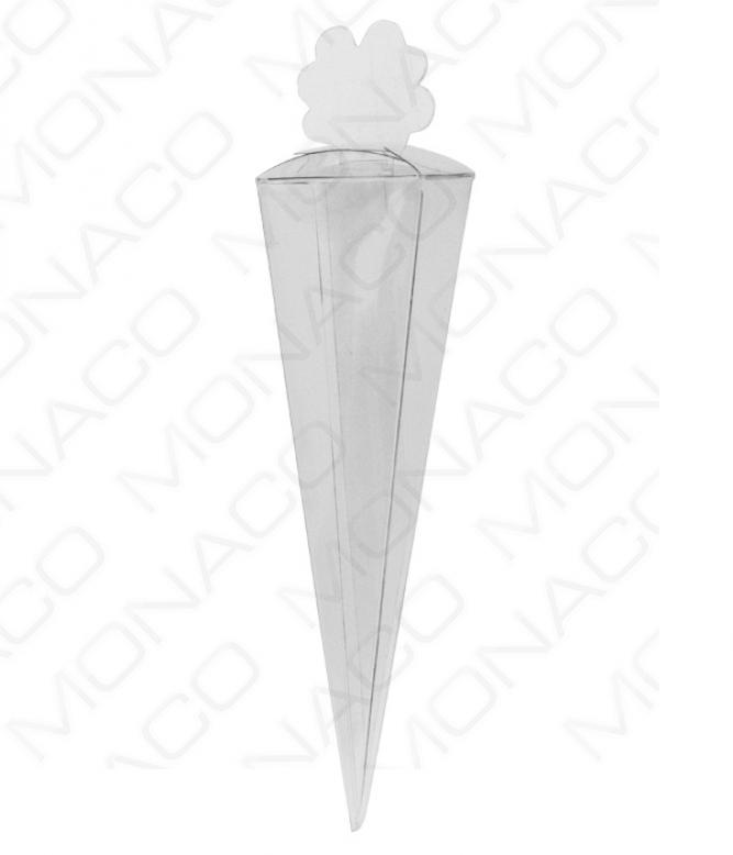 Plastová, průhledná krabička na svatební mandle s potiskem ve formě kornoutu s vytvarovaným čtyřlístkem v horní části . Elegantní a jednoduché provedení.Krabičky jsou standardně dodávány v rozloženém stavu.