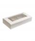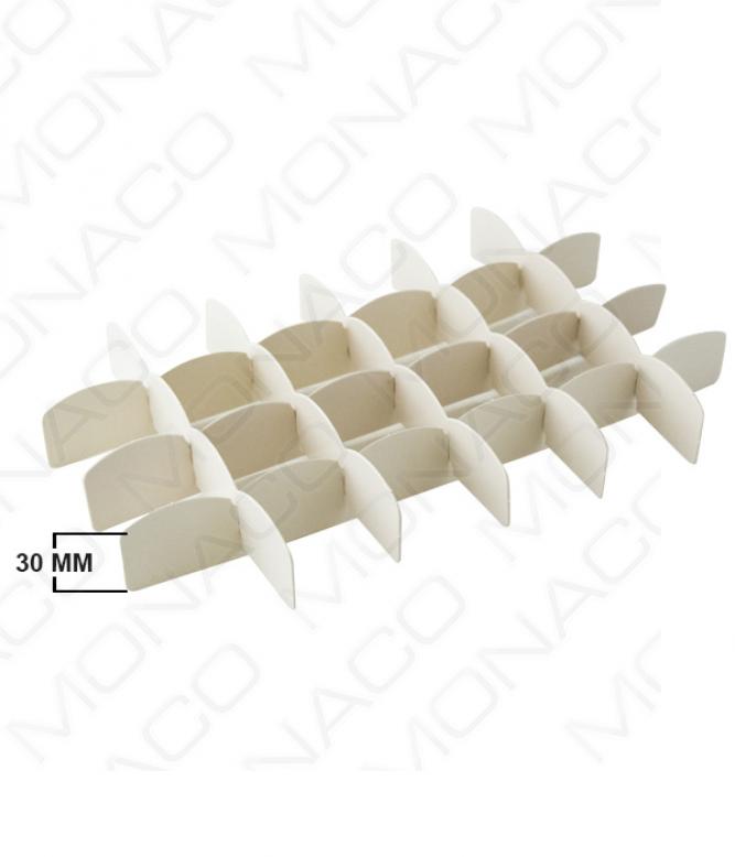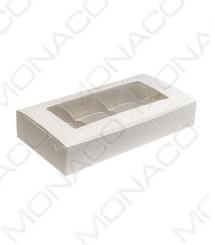 Papírová krabice z pevného kartonu v krémové barvě s jemným reliéfem kruhů, s plastovým průhledem ve víku a rozdělovačem na 8 políček.