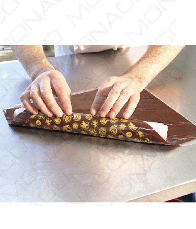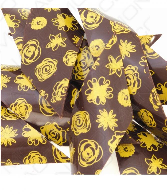 Fólie na dekoraci čokolády k použití zejména na pralinky, obtisky na dorty s čokoládovou polevou a ostatní čokoládové výrobky. Lze pomocí kakaového másla, které naleznete na nešwm webu - kód LESBUT1 přenést vzor transferové folie také jinam než na čokoládu, například na modelovací a potahovací hmoty, potřete je rozpuštěným kakaovým máslem, které se spojí s kakaovým máslem obsaženým v potisku na folii a tím dojde k přenesení motivu na požadovaný povrch. Necháte chvíli zchladnout a ztuhnout, poté opatrně sejmete folii.