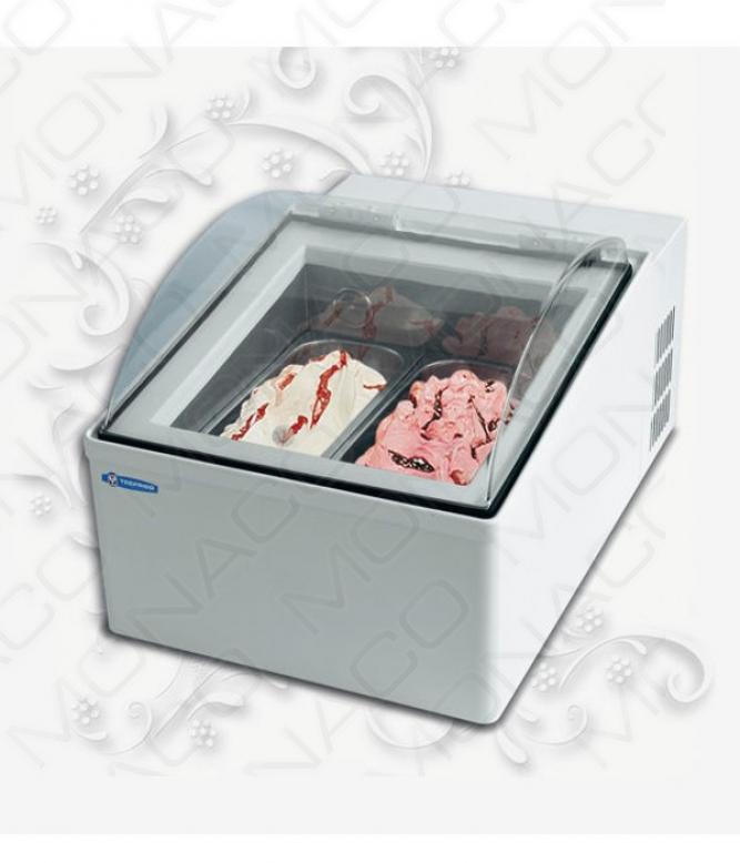 Zmrzlinová vitrína z lakovaného plechu a s plexisklovým víkem. Kapacita 4x 2,5l nebo 2x 5l GN. Mechanický termostat. Bílé provedení. Chladivo R134a. Ruční odtávání a odpařování kondenzované vody.Statické chlazení.