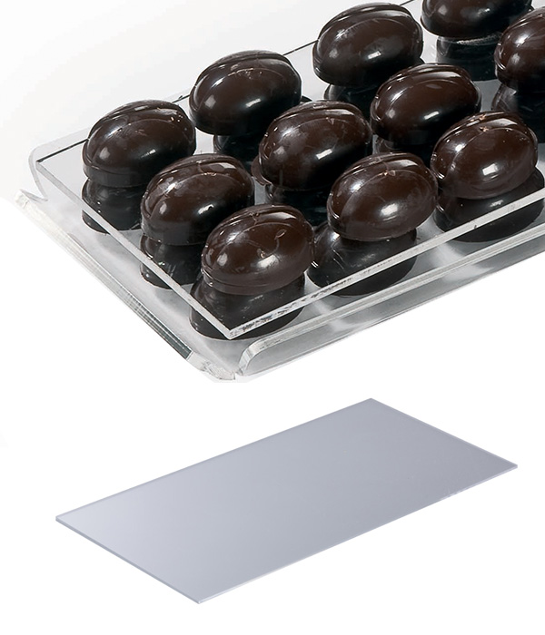 Průhledná police k tácu VP01106. S její pomocí lze skladovat pralinky na tácu ve více patrech.