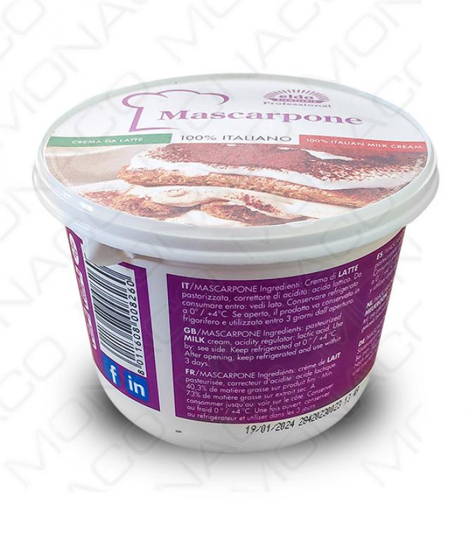 MASCARPONE 100% LATTE ITALIANO je jemný, čerstvý, krémový sýr vyráběný ze smetany z kravského mléka (Země dojení 100% Itálie), působením pomocí kyseliny mléčné. Původ tohoto sýru je z Lombardie (slovo mascherpa označovalo v tamějším dialektu sýr ricotta), dnes se však vyrábí po celé Itálii.